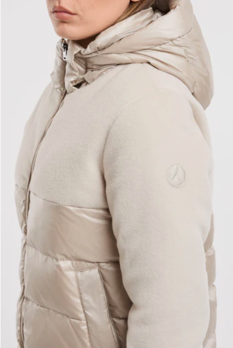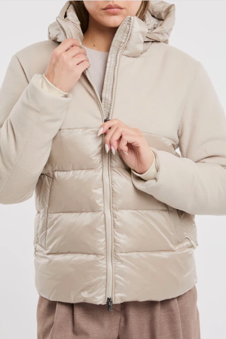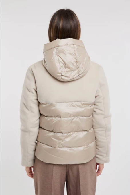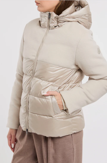 - Look ricercato realizzato in bimateriale: in lana sul petto, le spalle e le maniche e in nylon soft touch sul busto ed il cappuccio